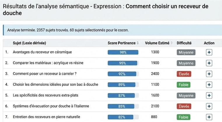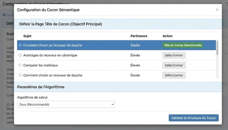 Les metamots sont donc calculés. Dans l’outil proposé, nous choisissons la cible « comment choisir un receveur de douche ». La figure 3 vous montre cette étape. Ensuite, la structure va se créer automatiquement dans l’outil Cocon.se.