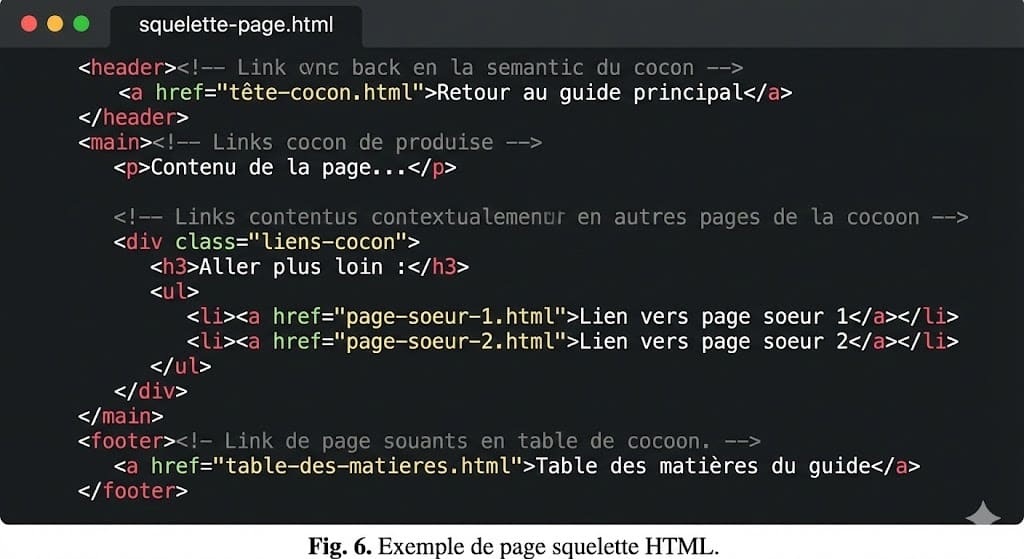 Vous restez libre, bien sûr, d’y mettre votre touche personnelle. Pensez, quand même, à donner envie à l’internaute de continuer la visite du cocon.