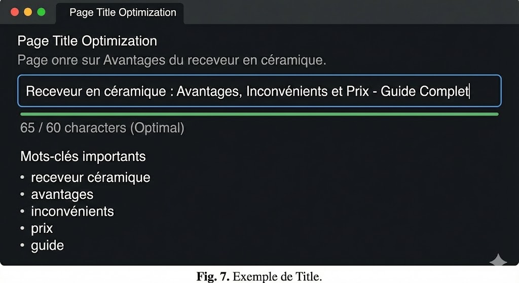 Passons au TITLE de vos pages de cocons à présent. Il doit reprendre le sujet, c’est assez logique. Il peut aussi contenir d’autres expressions attrayantes pour votre lecteur. Vous retrouvez ces possibilités dans l’outil utilisé ici, comme le montre la figure 7 :