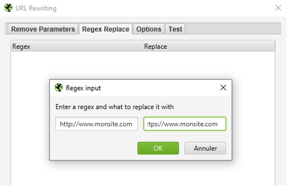 Par exemple, pour un site qui contiendrait encore de nombreux liens de la version HTTP vers HTTPS, les redirections 301 de HTTP vers HTTPS pourrait fausser l’interprétation des résultats relatifs aux codes réponse (avec de nombreuses 301 liées à la version HTTP). Vous pourrez donc ainsi faire abstraction de cette problématique (exemple : si les liens sont en cours de modification par les développeurs) en réécrivant les URL à la volée (Menu Configuration > URL Rewriting > Onglet Regexp Replace) :