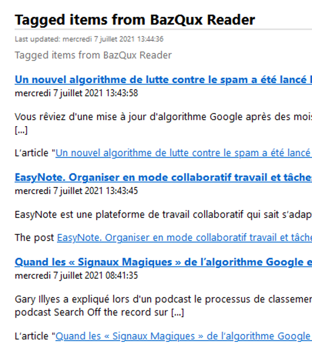 Enfin, il est possible de transformer en flux RSS sortant tout un dossier thématique ou, plus intéressant car plus sélectif, tous les items que l’on ajoute en favoris ou auxquels on assigne un tag. On pourra ensuite partager le flux RSS avec des collègues ou s’en servir par exemple pour générer une newsletter automatiquement avec un service prenant en compte le RSS2Email. Par exemple Feedbutler (https://feedbutler.app/en) ou, plus puissant, MailerLite (https://www.mailerlite.com/).