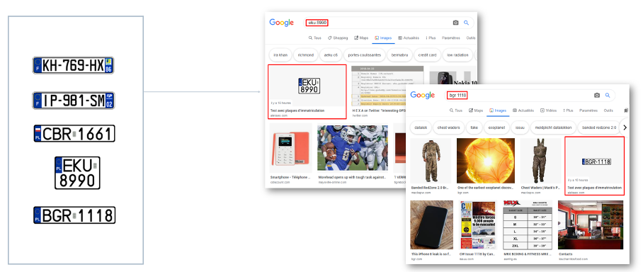 Pour cette première expérience, nous avons généré une série de plaques d’immatriculation existantes, mais qui respectaient les formats agréés. Les images portaient des noms choisis au hasard sans mention de ce qui est affiché sur l’image. Les images des plaques ont été publié sur des pages web et soumis dans Google à travers la Search Console.